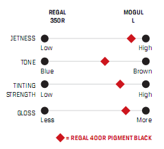 Regal 400R 和MOGUL L、350R炭黑在黑度、色調、著色、強度及光澤方面的對比: